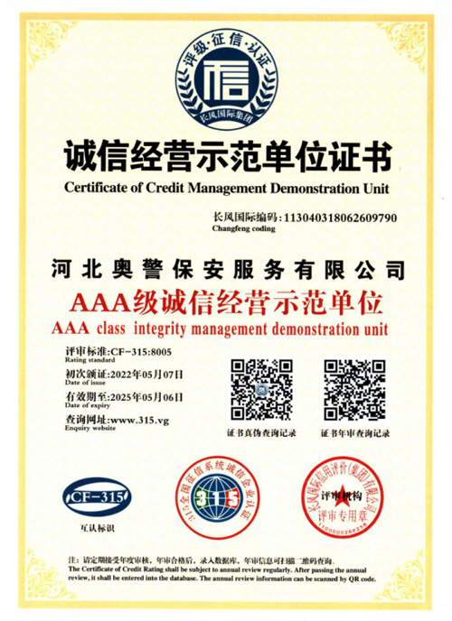 “忠誠的伙伴,非凡的朋友”,河北奧警保安服務有限公司本著“客戶的需求就是我們的追求”的服務理念,與廣大客戶攜手并進、共創恢弘偉業。